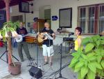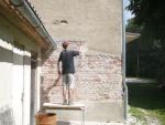 Týdenní akce ve dnech 2. - 10. 8. 2008Druhá týdenní třešťská akce byla z obou stran ohraničena víkendovými parními jízdami na trati Slavonice - Kostelec. V klubovní budově byla výstava připravena již od předchozí brigády, takže na sobotní jízdu jsme byli s Dnem otevřených dveří připraveni. Parní vlak stál ve stanici Třešť 4 hodiny, na perónu vyhrávala folková kapela, prodávaly se párky a pivo. Jen návštěvníků bylo viditelně méně, než při loňských parních jízdách, zaplnili pouze perón, kde pro ně bylo připraveno posezení, zatímco loni jim málem nestačila ani plocha za nádražím. Přitom počasí bylo příznivé. V neděli parní vlak jezdil jen v úseku Telč - Slavonice, takže v Třešti už byl klid. Na třešťský týden přijeli další členové klubu, včetně těch nejmladších a dokonce i pár nečlenů, kteří ovšem rovněž neváhali přiložit ruku k dílu. Za to se jim dostalo odměny ve formě výživných obědů, které v klubovní ubytovně vařil Jarda Blažke, a když nevařil, tak "wapkou" čistil budovu od zbytků neotlučené omítky. Cílem brigádnického týdne bylo dodělat dílnu, dokončit výměnu shnilých dřevěných konstrukcí a podlah uvnitř budovy a zbavit klubovní barák opadávající omítky, aby se mohla v příštím roce nahodit omítka nová. K tomu účelu bylo objednáno pojízdné lešení, přistavené v úterý. Do té doby se omítka otloukla do výše, kam až šlo dosáhnout ze země, s lešením se pak pokračovala ze strany perónu až po střechu, oba štíty otloukl vlastnoručne Honza Mottl ze žebříku, postaveném na přístavbách. V pátek pak přijel traktor s valníkem, aby odvezl na skládku otlučenou omítku, v poledních hodinách byla skoro slavnostně rozsvícena nová dílna a odpoledne se začalo s úklidem a obnovou vnitřní expozice na nadcházející víkendovou parní jízdu. Bylo také opraveno další místo, kde v minulosti dlouhodobě zatékalo a kde byla dřevěná konstrukce zcela zpráchnivělá. Shnilé fošny podlahy a cca dva metry nosného trámu jsou nahrazeny novým materiálem, který jsme pořídili (stejně jako loni) v telčské pile. Nový trám je navázán zámkem a stažen ke zdravému zbytku stávajícího závitovými tyčemi. Pokládka podlahy novými fošnami zacelila poslední vážně poškozené místo dřevěné konstrukce v domě. Nakonec bylo provedeno zpevnění podlahy prvního patra, kde byl v minulosti vyřezán trám a mezi patry vytvořen velký otvor. Ze zbytků starých fošen byla vyspravena menší poškození podlah v různých patrech. Jako náhradu za vrácenou kůlnu nájemkyni z nádraží si radioklub pronajal od SŽM přístavek na straně budovy směrem k nádraží, s možností budoucího odkupu. Máme zde uložený veškerý stavební materiál, který by ve sklepě hlavní budovy zbytečně trpěl vlhkem a taky dříví a uhlí na zimní topení. Při parní jízdě ve dnech 9. a 10. srpna se kromě tradiční lokomotivy 310.922 "Kafemlejnek" na třešťských kolejích objevil i brněnský rychlík, tažený parní lokomotivou 475.101 "Šlechtična".