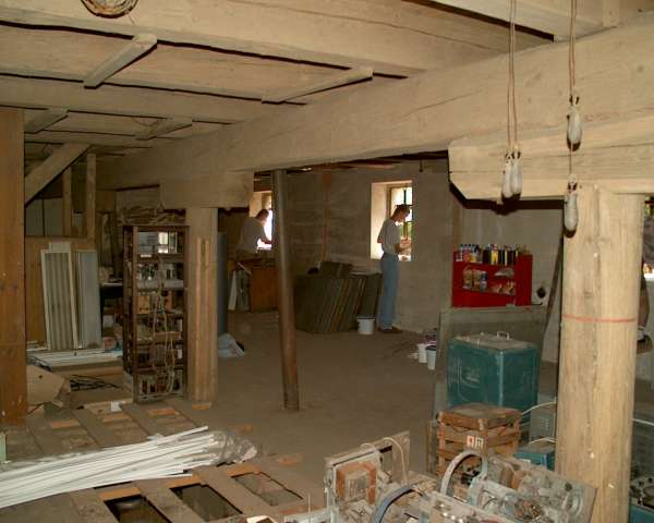 Práce na oknech. V neděli se skoro každému oknu někdo věnoval. Vpravo na fotografii lze vidět lanovody se závažím k ovládání sypacích klapek. V průběhu týdne byly demontovány.
