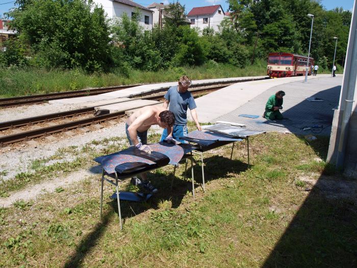 Znaková akce 25. - 27. 6. 2010Na první týdenní akci v červenci je naplánován nátěr fasády a současné zavěšení obou tesláckých znaků na štíty budovy, ty musí být do té doby hotovy a smontovány. A to bylo cílem víkendové akce ve dnech 25. až 27. 6. 2010. Během dvou dnů se podařilo obrousit kostry znaků i znakové sady z hliníkových plechů a opatřit je základním i vrchním nátěrem. Pozadí znaku bude bílé, písmena, vlnovka a hvězda červené, stejně jako kdysi na budově v Praze - Hloubětíně, než byly přetřeny na modro.