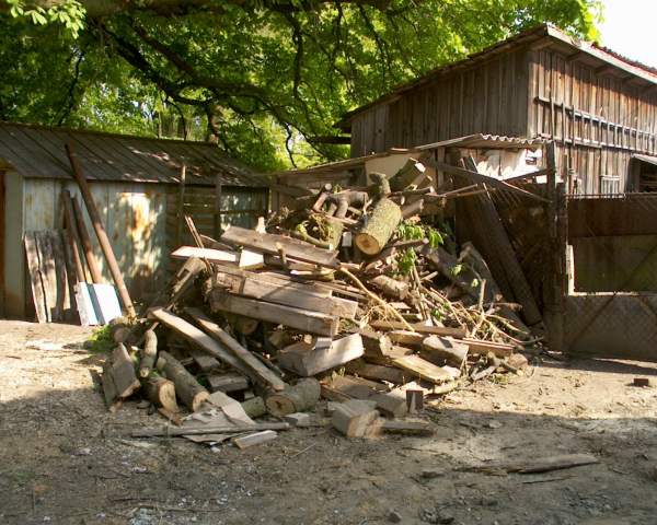 Hromada dřeva z pořezaných stromů a zbourané kůlny a části rampy. Ztrouchnivělé části kůlny a okolí byly ihned spáleny.