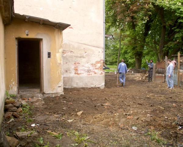 Pozemek po zasypání a uhrabání jámy. Pamětníci si možná vzpomenou, že v těchto místech stávala dřevěná kůlna. Místnost bez dveří vlevo je sklad uhlí, o kterém se myslelo, že tam býval záchod.